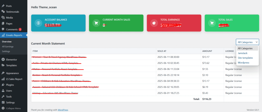 The Envato Sales Report WordPress Plugin provides a simple and efficient way to track your Envato marketplace sales directly from your WordPress dashboard. Designed for Envato authors, this plugin offers real-time sales statistics, revenue tracking, and detailed reports without the need to log in to multiple platforms.